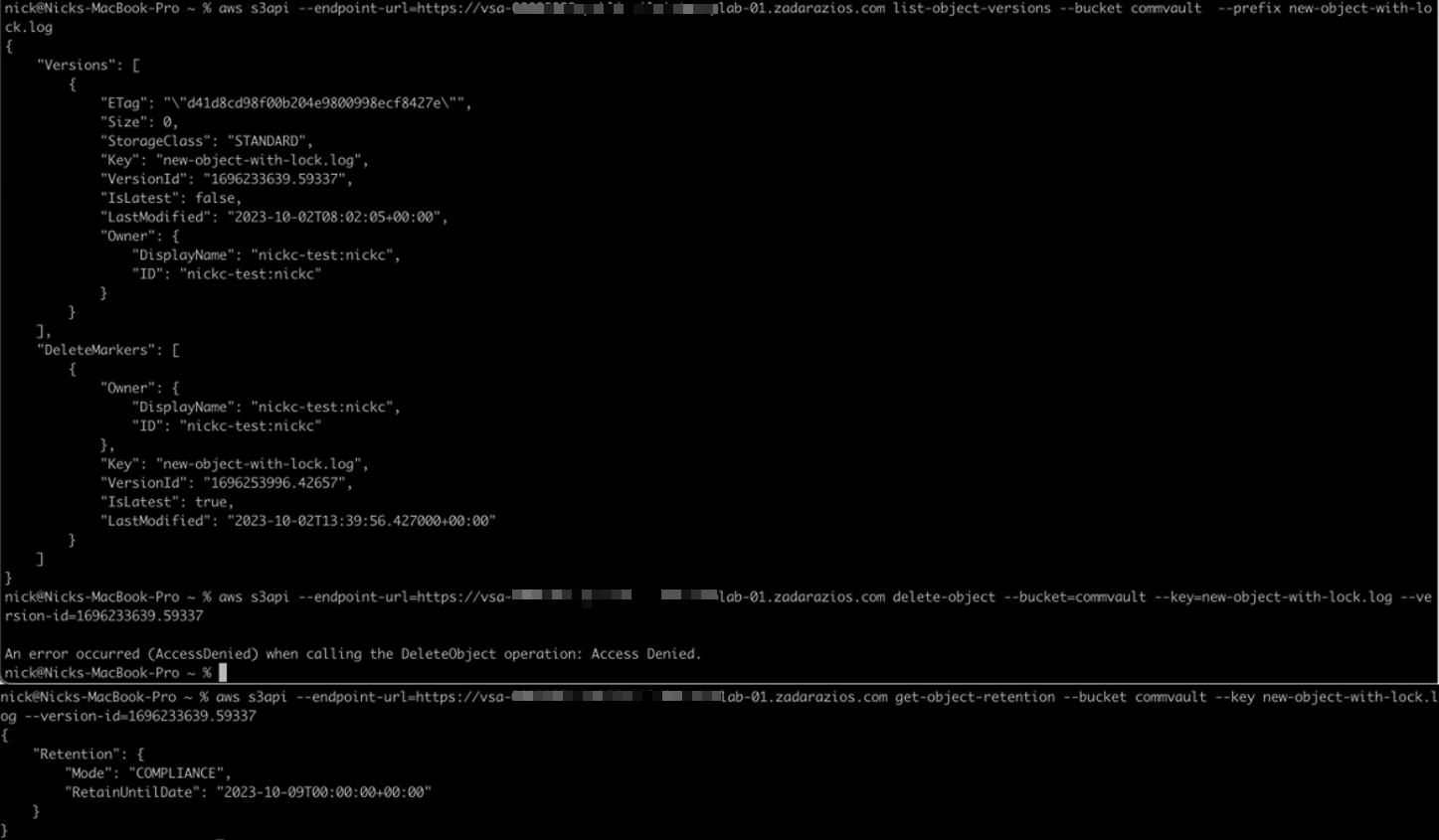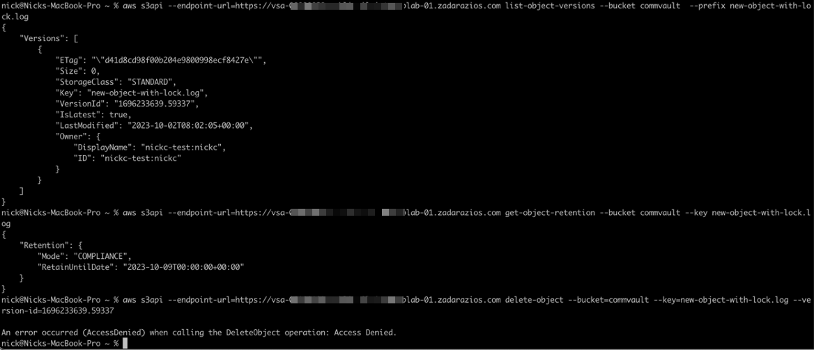 - user@users-MacBook ~ % aws s3api –profile $AWSUSER –endpoint-url=$ENDPOINT get-object-retention –bucket $BUCKET –key bkpctrl/<uid>/<folder>/…/<object name>