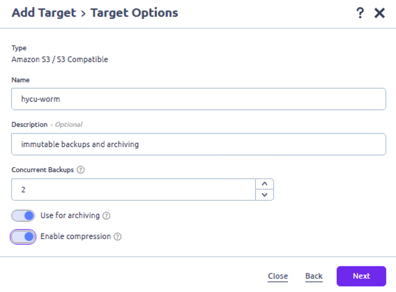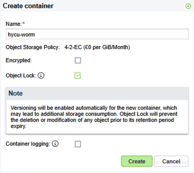 This step is crucial to enable the Object Lock retention timeframe to be set on all objects that will be written into the container. The timeframe set here will be the minimum retention period. If required, the retention timeframe can be set to a longer period in the HYCU Backup Policy.