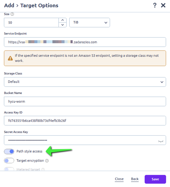 - For Service Endpoint enter the API endpoint URL for Zadara (e.g., https://vsa-<your Zadara Object Storage URL here>.zadarazios.com).