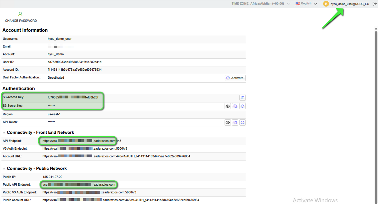 - The Access Key, Secret Key and API Endpoint for the Object Store can be found under “User Information” by clicking on the username at the top-right corner of the UI. These credentials will be used by HYCU to authenticate and interact with the Zadara container.
